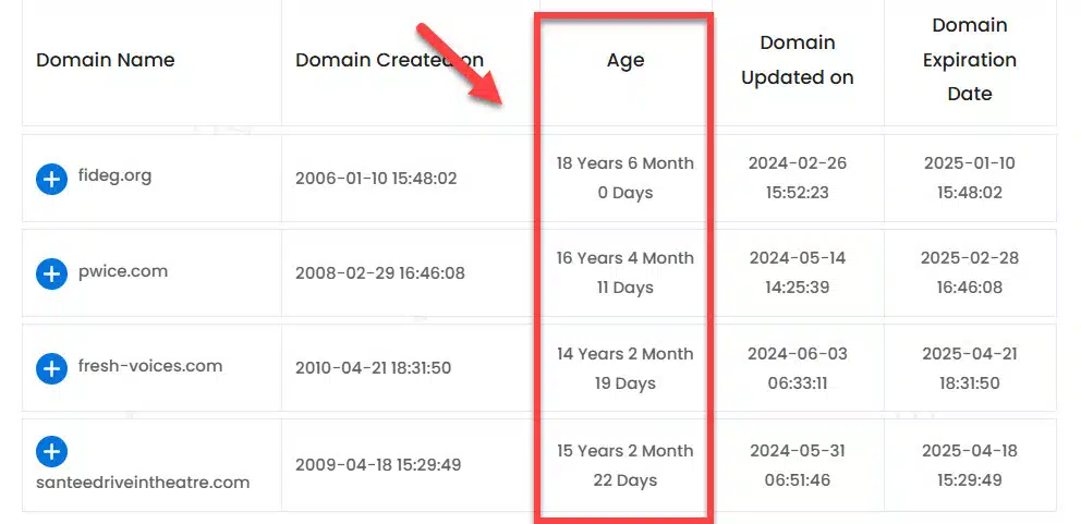 เว็บอายุของโดเมนหลัก 10 ปีขึ้นไปทั้งหมด ซึ่งเป็นสิ่งยืนยันว่าโดเมนหมดอายุ นำมาใช้ทำอันดับ SEO ได้เป็นอย่างดี แต่พลังของโดเมน ไม่ได้ดูแค่อายุเพียงอย่างเดียว ต้องพิจาณา เรื่องของ ประวัติการเคลื่อนไหวของข้อมูลในอดีต รวมถึงประวัติความน่าเชื่อถือของ Backlink ที่เคยได้รับด้วย ศึกษาเรื่องนี้เพิ่มเติมได้จากบทความนี้ครับ วิธีคัดเลือกโดเมนหมดอายุ