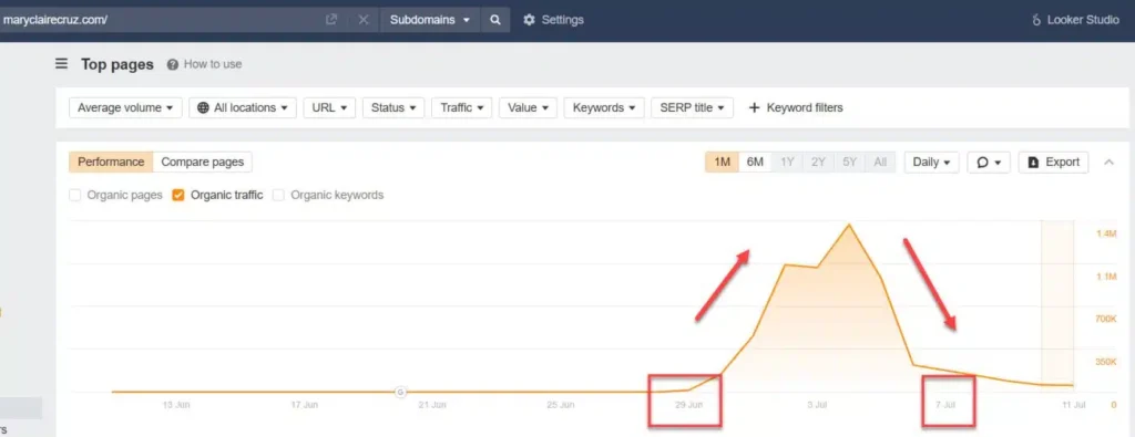 จากรูปตัวอย่างเราจะพบว่าเว็บ maryclairecruz.com ใช้เวลาในการทำอันดับแค่ ไม่กี่วันในการติดอันดับ Google แต่ก็ติดอันดับต่อเนื่องได้แค่ 7 วัน เว็บก็ถูกลดอันดับลง และหายไปจากระบบ Google
