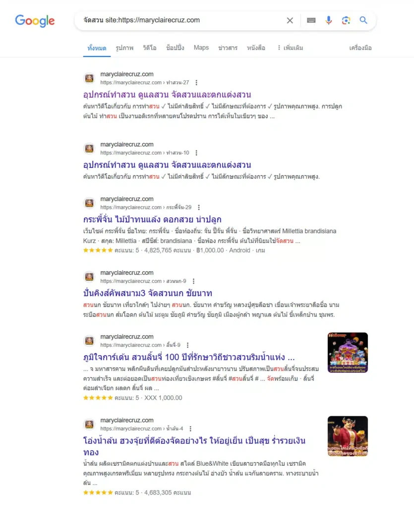 ตัวอย่าง ผมจะลองพิมพ์ประโยคนี้ลงไปบน Google “จัดสวน site:https://maryclairecruz.com”