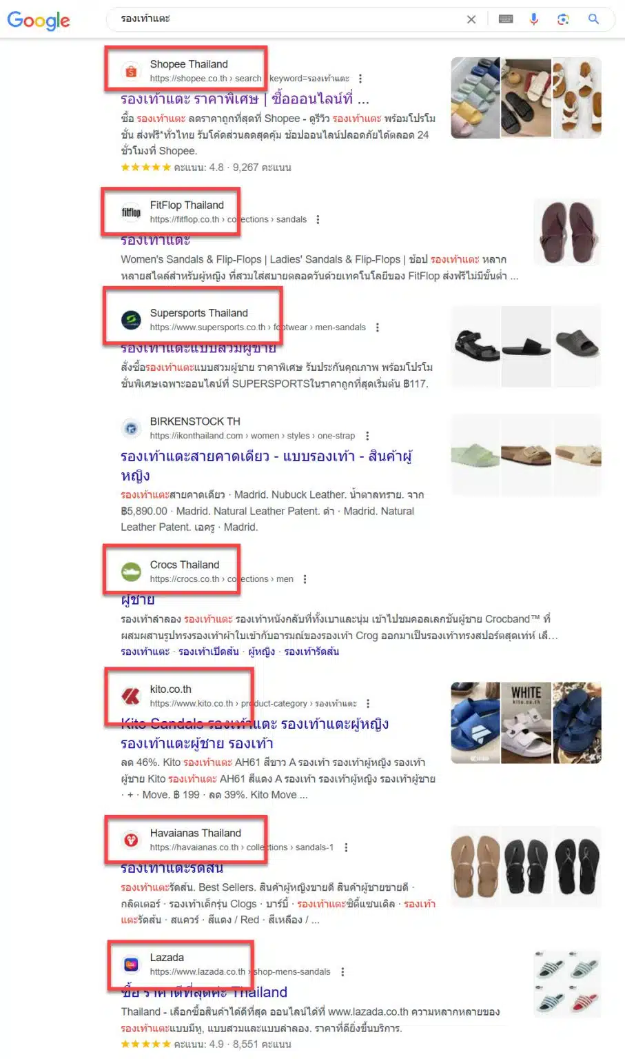 เมื่อโดเมนนามสกุล .th มีพลัง หากคุณมีแผนจะสร้างเว็บไซต์ แทนที่จะไปจด .com ตามความคุ้นเคย ก็ให้เปลี่ยนมาจดนามสกลุเป็น .co.th ไปเลย เราจะได้มีแต้มต่อในการทำ SEO นั้นเอง หลายๆ เว็บก็มีการเปลี่ยนมาใช้ .co.th เพื่อมาทำอันดับ SEO สู้กัน ตัวอย่าง ถ้าเราค้นหาคำว่า “รองเท้าแตะ” 9 ใน 10 เว็บที่ติดอันดับหน้าแรก ล้วนมีนามสกุล .co.th